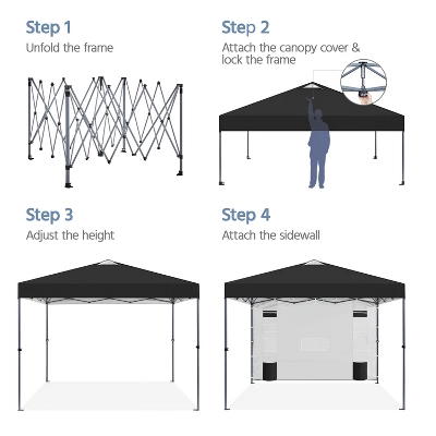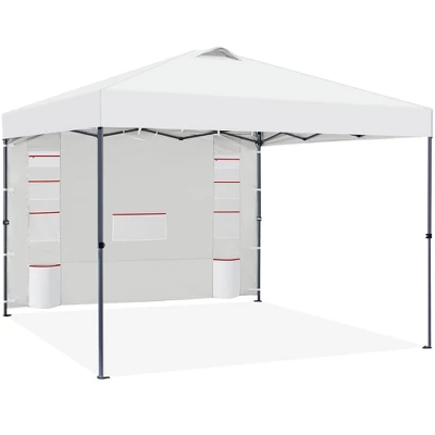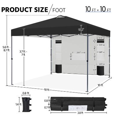 - Beat the heat with this 10ft × 10ft Pop-Up Canopy! Built with rugged silver-lined Oxford fabric and a sturdy powder-coated steel frame, this instant canopy tent shields you from the scorching sunlight while ensuring durability. The one-push-to-lock mechanism simplifies the setup for you, and the freely adjustable height (5.6′ to 8.7′) lets you find your ideal fit. For added functionality, the canopy features a versatile sidewall that not only enhances wind, sun, and privacy protection but also includes nine varied-sized storage pockets and a handy hanging strap—ideal for keeping everything from small essentials to volleyballs or rackets neatly organized and within easy reach. Whether it’s a backyard hangout, beach party, or outdoor event, this canopy comfortably shades ten people. Better yet, it comes fully equipped with a roller bag, guy lines, ground anchors, and sandbags to keep things steady and convenient.