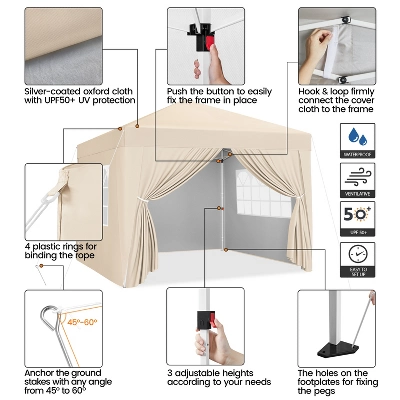 - Adjustable height: The whole height of this patio canopy is adjustable from 8.3ft to 9ft, with three different positions. You may press buttons to change the length of the tubes according to your needs.