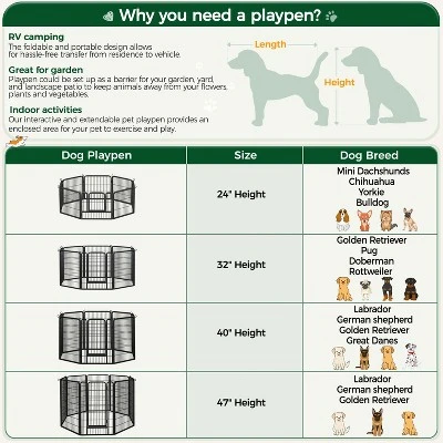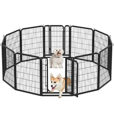 - Our pet playpen is made of premium steel with a black finish, which ensures a long life span. This pet fence creates an enclosed area with an open top for pets to play and exercise. You can use this pet playpen to limit your pet’s exercise area or to separate him/her from different pets. This heavy-duty pet playpen is suitable for dogs, ducks, rabbits, etc. It is easy to set up with no tools required. It can be used indoors or RV camping, traveling, or for other yard activities. Panels are connected by metal stakes, which allow this dog playpen to be flexibly built in various shapes by adding or removing panels.