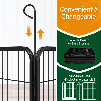 - 【Safety & Security】Ensuring the safety of your pets is of utmost importance to us. Our exercise pen is crafted with appropriate bar spacing and the latches that lock automatically as you close the door. Rounded edges also protect animals from injuries while preventing damage to wood or PVC floors. Additionally, stakes anchor the panels firmly to the grass or soft ground.