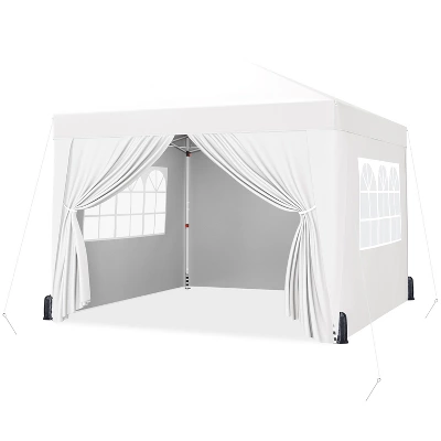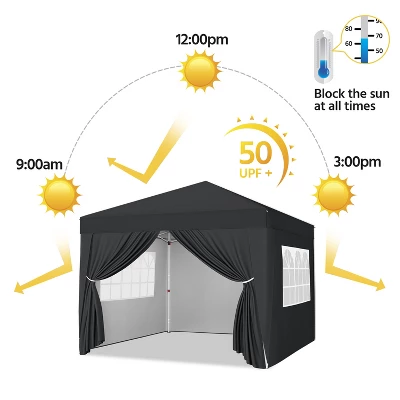 - This 12 × 12ft Pop-Up Canopy is the seamless combination of comfort and style for all your gatherings. Crafted with hard-wearing polyester canopy fabric featuring a UPF 50+ UV protective coating, this canopy is your go-to solution for creating a cozy and shaded haven. The powder-coated steel frame and truss ensure durability and a touch of elegance. For improved protection, this canopy features three detachable sidewalls and a mid-zip sidewall, providing enhanced protection from the elements while maintaining a bright and cheerful atmosphere. The two sidewalls with transparent windows add a delightful touch, allowing natural light to illuminate your space. Compact and convenient, this canopy collapses into a compact size when stored in the included roller bag, making it your hassle-free companion for on-the-go adventures. This canopy set includes four guy lines, twelve metal ground anchors, and four sandbags for convenience and safety.