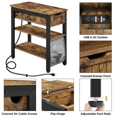 - Are you looking for a practical end table without sacrificing style? This wooden end table with charging station will give you a distinctive rustic feel and technical elements. The hidden hinges allow the tabletop to flip open, revealing 2 built-in power outlets and 2 USBs for charging multiple devices, such as cellphones, tablets, table lamps and more. This end table is made of high-quality P2 MDF and iron material to serve you for a long time. This chair side table features 1 practical drawer, 2 bottom storage shelves and an extra storage bag, which offers ample storage space to keep items orderly and organized. Thanks to its narrow design, it can be positioned in various settings, including your hallway, guest room, home office and living room.