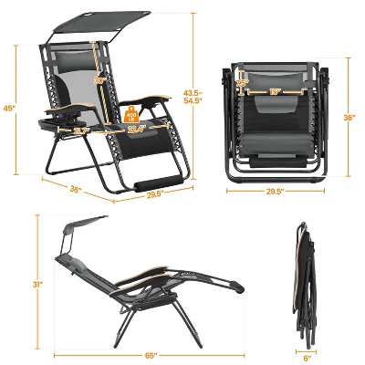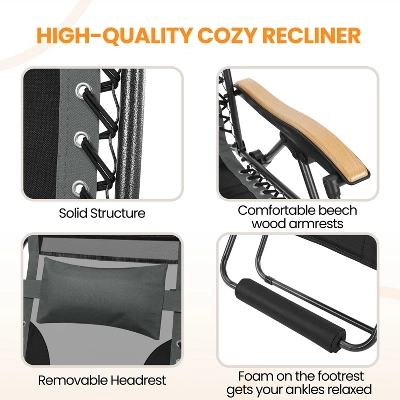 - 【Sunscreening Cool Camping Recliner】This 29-inch zero gravity outdoor recliner, featuring an adjustable sunshade, a mesh backrest, and beech wood armrests, aims to provide cool relaxation on hot days. You can adjust the sunshade’s angle to block the sun at different times of the day; and the backrest, with excellent breathability, can keep your body cool and dry