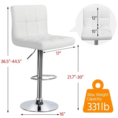 - Adjustable bar chair is constructed of premium PU, foam, and iron, with solid structure holding up to 330 lb, sturdy and for long-term use. Height adjustable range is 36.2-44.5″, which can meet your varied needs. 360°swiveling design is convenient for you to move the chair or fetch files/books, very practical. Stylish design makes it compatible seamlessly with any decor.