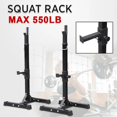 - There are two heavy-duty solid metal squat racks for barbells. The barbell stands are adjustable to meet your needs. H-shaped bases make it stable while using. Anti-slip feet pads protect your floor from scratches.