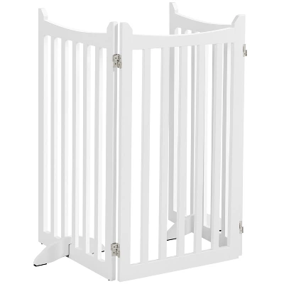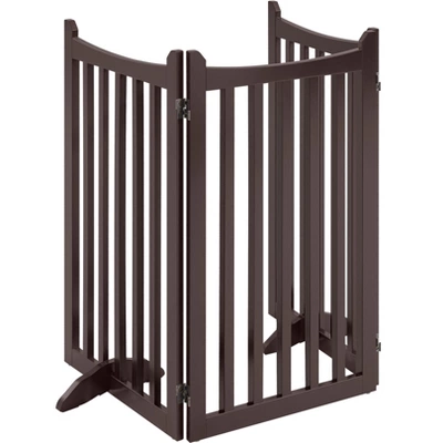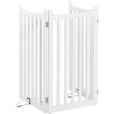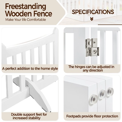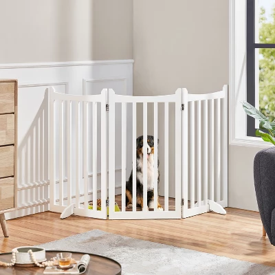- Constructed from a sturdy CARB P2-compliant MDF structure, this three-panel wooden pet gate keeps your dog, puppy, or other pets contained when you are not around. It not only ensures the safety of your pets but also adds a decorative and attractive element to your home. You can adjust the width of the gate to block any entry points effectively. The wooden fence consists of three panels connected with solid hinges, allowing it to be folded into different configurations, such as an I/Z/U shape. The gate also features protective footpads and EVA foam to prevent scratching and stabilize uneven floors. It is suitable for doorways, entryways, halls, bedrooms, and staircases.