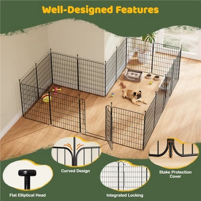 - Need a safe, flexible space for your pet to play? This versatile 8-panel puppy playpen offers a versatile and lightweight solution, catering to the unique needs of smaller pets. With sturdy metal wires and tighter gaps, it’s built to last and keep your pet safe. The one-handed integrated lock makes access a breeze. The metal stakes boast a flat-top design and protective covers to prevent any scratches on your floors for indoor use. Ideal for both indoor and outdoor use, this metal pet fence is a spacious, comfortable alternative to traditional cages, keeping your pet happy and safe wherever you are!