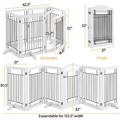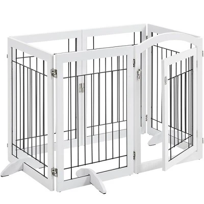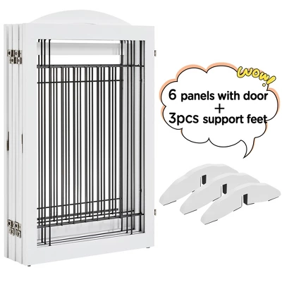 - Constructed from a durable MDF and metal, keep your dog, puppy, or other pets confined while you are away. This pet gate is a safe and efficient way to limit your pets while offering a decorative and handsome touch to your home. The pet gate is connected with 6 separate panels and secured with sturdy hinges allowing the gate to fold out into a Z-shape or rectangle configuration. Protective footpads and EVA foam protect the floor from scratching and uneven the floor. Suitable doorways, entryways, halls, bedrooms, and staircases.