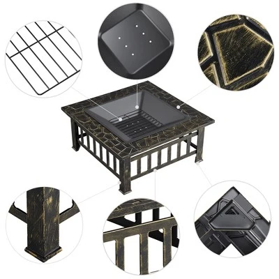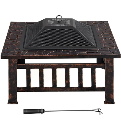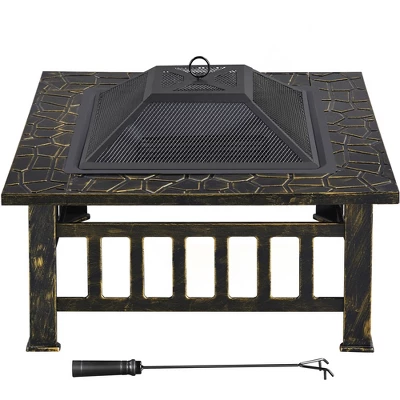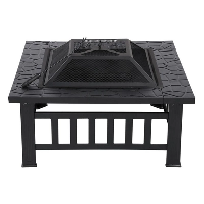 - This outdoor square fire pit is constructed of heavy-duty iron mesh and frame and built in a square shape for added stability. It comes with a mesh lid to prevent burning embers from blowing and a fire poker to stoke fire and remove the mesh lid safely. The provided outer cover helps keep the fire pit clean and dry. This sturdy square fire pit is an ideal choice for heating, barbecuing, and cooling drinks and food in the patio, garden, and yard.