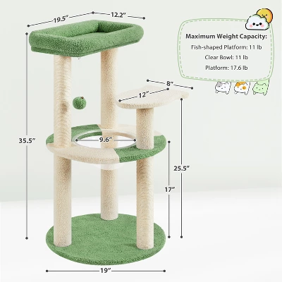 - 【All-In-One Cat Playhouse】Furnished with a cozy rectangular platform with foam padding, a transparent cat bowl, a comfy fish-shaped perch, a toy ball, and 2 sisal-coiled posts, this cat tower is heaven for kittens to rest or sharpen their claws.