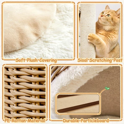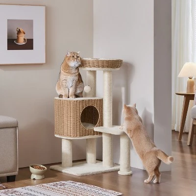 - Bring style and comfort to your cat’s space with this rattan cat tree. Featuring a cozy nest, condo, sisal post, and playful pompom, it blends natural textures with functional design. Crafted with soft plush, PE rattan, and sturdy boards to support rest, play, and scratching in one charming spot.