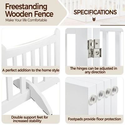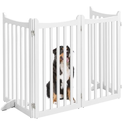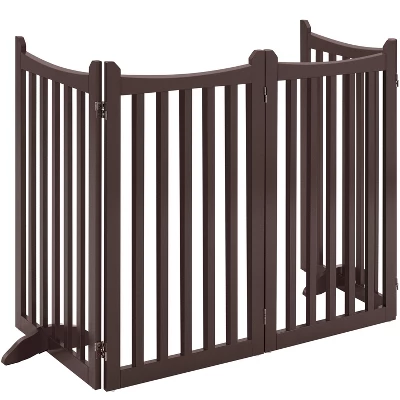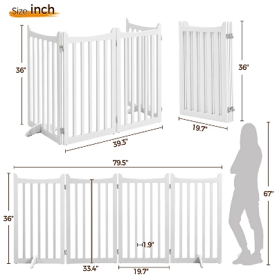 - Constructed from a sturdy MDF structure, this 4-panel wooden pet gate keeps your dog, puppy, or other pets contained when you are not around. It not only ensures the safety of your pets but also adds a decorative and attractive element to your home. You can adjust the width of the gate to block any entry points effectively. The wooden fence consists of four panels connected with solid hinges, allowing it to be folded into different configurations, such as an I/Z-shape or square. The gate also features protective footpads and EVA foam to prevent scratching and stabilize uneven floors. It is suitable for doorways, entryways, halls, bedrooms, and staircases.
