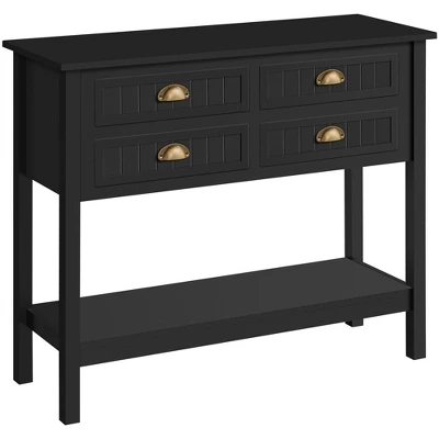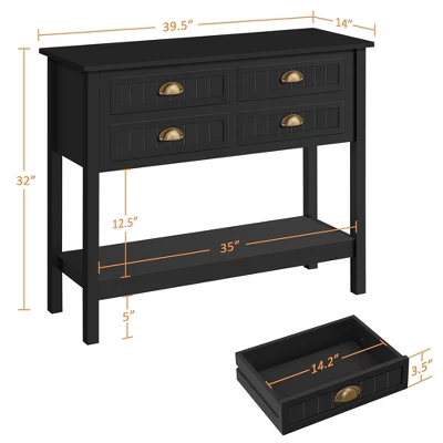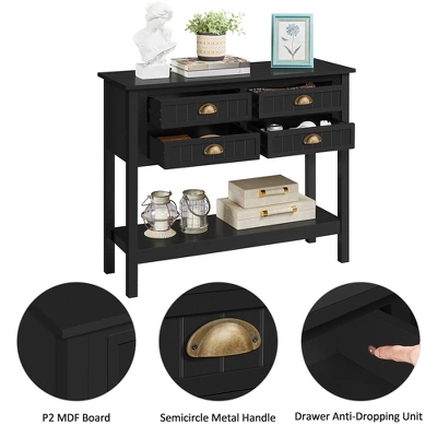 - This 2-layer console table is a perfect blender of high quality, practicality and chic style!We give top priority to the selection of the materials to ensure that this console table can serve you well for a long-time. Besides, the surface of the whole piece is protected by a water and slight scratch-resistance veneer, facilitating your daily maintenance on the one hand, and on the other hand, keeping this table as good as new after years of usage.4 drawers and an open shelf are provided for classified storage. You have spacious space to store your items orderly. Besides, to make it better integrated into various room décor, we design this entryway table into a classic and minimal style. We are devoted to creating the pleasant furniture supplies to make your life more comfortable!