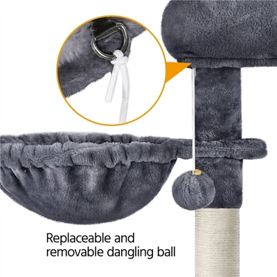 - This cat tower is made of selected materials and covered by soft plush and connected by metal accessories. This cat tower has different levels and sections for cats to play and sleep, condo, nest, and basket. Also, there are four scratching posts and a scratching board for cats to exercise. This good-quality cat tree will not let you and your cats down.