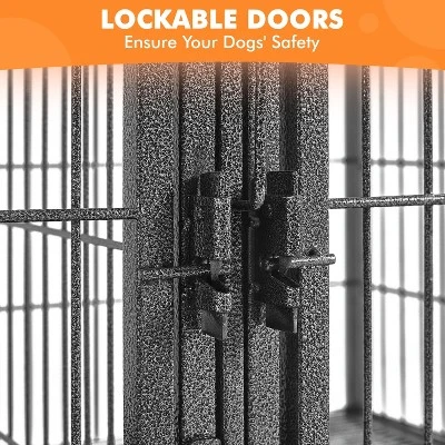 - A spacious home for dogs and a great investment for multi-dog households, breeders, groomers, trainers, and vets! Crafted from durable metal wires with a water-resistant powder coating, this dog crate provides a sturdy and comfy home for puppies and small to medium-sized dogs like chihuahuas, corgis, pit bulls, border collies, and mini schnauzers. The crate has a removable middle divider, allowing for flexible configuration. With the divider inserted, you can have two smaller compartments, or remove it to create a larger cage. This kennel has four smooth-rolling industrial wheels, making it easy to move around. The top of the dog cage can be fully opened for easy inspection and cleaning. It also has small feeding doors with latches, providing convenient access to the stainless-steel dog bowls. Best of all, you can stack 2 of these kennels together to have 4 separate condos within a compact area at most. Simple assembly is required.