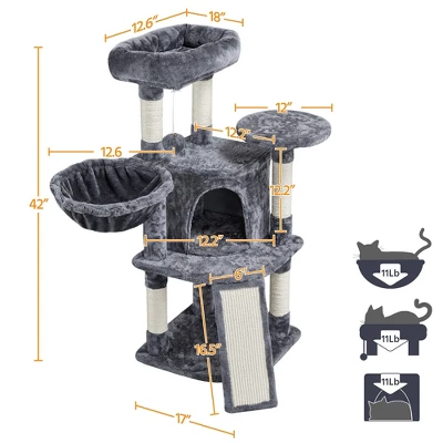 - Our cat tower is made of selected particleboard and covered by soft plush and connected by metal accessories. This cat tower has different levels for cats to play and sleep, the condo, platform, basket, etc. Also, there are several scratching posts and a scratching board for cats to exercise. This quality cat tree will not let you and your cats down.