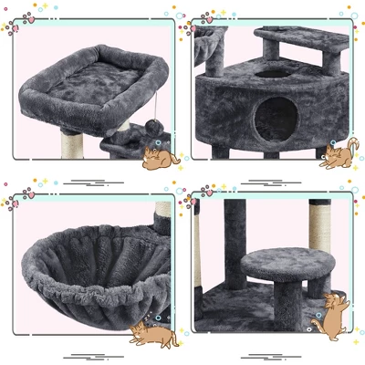 - To satisfy cats’ habits and hobbies, we present this multilevel cat tree to you and your cute kitten. This cat tower is made from durable particleboard and soft plush, very soft and comfortable for cats to play and sleep. This cat tree has multiple levels and an interesting layout. With a top perch, a basket, several platforms and a condo, this is a good place for cats to play and rest, full of joy and happiness.With an anti-toppling strap attached to the cat tree, it is stable and sturdy.