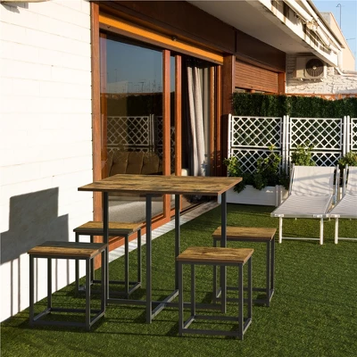 - This square wooden&metal table set provides you a perfect dining area without taking up too much room. Made of premium engineered wood and a sturdy iron frame, this dining set is sturdy and durable for long serving time. Each set includes 1 table and 4 stools, so you and your family or friend can enjoy a quick breakfast or afternoon coffee cozily. With a space-saving design, you can store these four stools under the table when not needed. This set comes with a stylish rustic flavor, while the clean-lined silhouette makes it more sleek and modern. Great for the dining room, kitchen, living room, bar, apartment, etc.