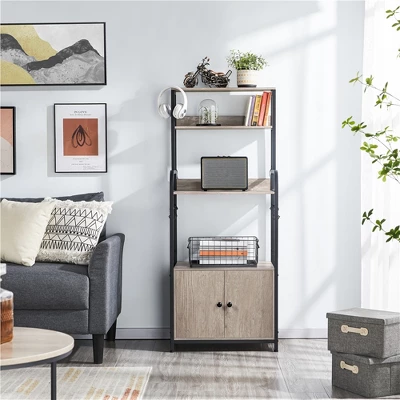- Declutter your kitchen or living room with this chic utility storage shelf with a cabinet. Founded atop four legs in a matte black finish, this piece features a quality iron frame, CARB P2 compliant manufactured wood, and water- and heat-resistant veneer that’s very easy to clean. Offering 3 multi-sized open shelves and a roomy storage compartment, you can put go-to kitchen needs and smaller appliances like microwaves, and coffee makers corralled and handy. Eight ball-end S-hooks keep potholders, mugs, and dishcloths dry and clean. The weather-worn look contrasts nicely against the black metal frame, which makes this baker’s rack a perfect addition to a variety of styles, especially rustic barn-style and industrial design.