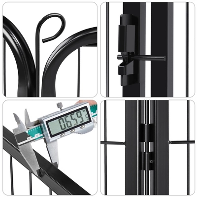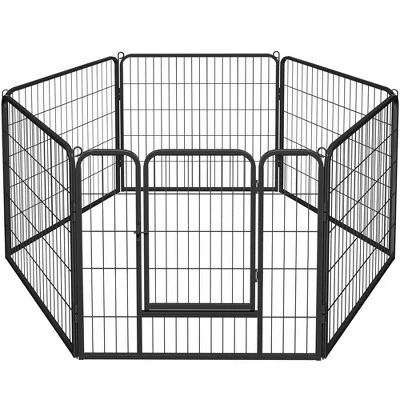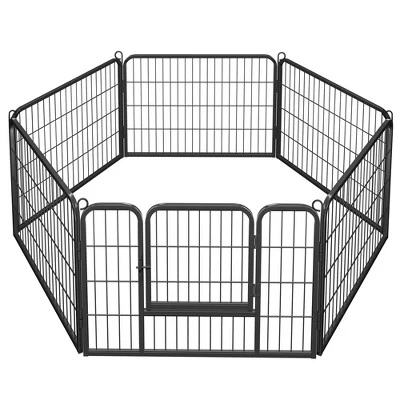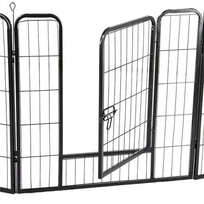 - This pet playpen is made of premium iron with a black finish, which ensures a long life span. This pet fence creates an enclosed area with an open top for pets to play and exercise. You can use this pet playpen to limit your pets’ exercise area or to separate him/her from different pets. Panels are connected by metal stakes, which allow this dog playpen to be flexibly built in different shapes like octagon, square, and rectangle in different sizes by adding or removing panels.