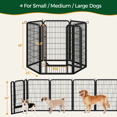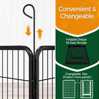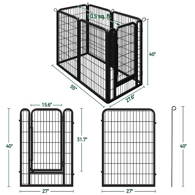 - Our pet playpen is made of premium steel with a black finish, which ensures a long life span. This pet fence creates an enclosed area with an open top for pets to play and exercise. You can use this pet playpen to limit your pet’s exercise area or to separate him/her from different pets. This heavy-duty pet playpen is suitable for dogs, ducks, rabbits, etc. It is easy to set up with no tools required. It can be used indoors or RV camping, traveling, or for other yard activities. Panels are connected by metal stakes, which allow this dog playpen to be flexibly built in various shapes by adding or removing panels.