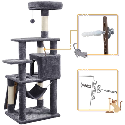 - Buy your cutest cats this cat tree, and they will be happy forever! This cat tree tower will bring much fun and comfort as it is constructed of quality particle board, natural sisal, and skin-friendly soft plush fabric. This multi-level cat tree condo can accommodate 2 small/medium cats with a comfy plush perch, a roomy cubby, a soft hammock as their lounging/napping spots, and multiple scratching posts to sharpen their claws.