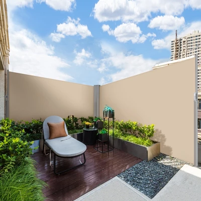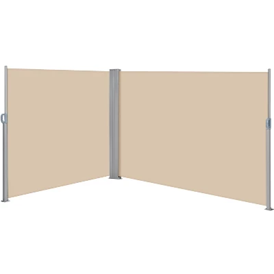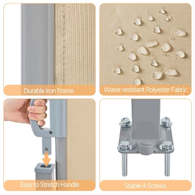 - The Double Retractable Side Awning is practical and efficient to elevate your outdoor experience! Constructed with weather-resistant materials, this side awning features a robust iron frame and durable polyester fabric with a PU coating for increased sturdiness, durability, and stability. With a maximum length of 19.7′ and a height of 71″, this patio side awning provides a shield against scorching rays, keeping your home cool during the sweltering summer months. It is an ideal addition to any home, whether you want to create a cozy nook in your garden, a serene spot by the poolside, or a charming corner in your courtyard. Simple assembly is required, and the side awning should be fixed to hard surfaces with bolts for optimal stability.