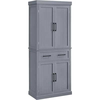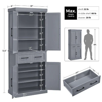 - Spacious, elegant and thoughtfully designed, this tall pantry cabinet provides ample storage while keeping all your items clean, accessible, and meticulously organized. Inside you’ll find a variety of storage solutions for all items, including; in-door cabinets, a large central smooth-gliding drawer, and adjustable shelves. The freestanding kitchen pantry cupboard’s classical design effortlessly matches any contemporary space in your home, from the living room and kitchen to, yes, even the home office.