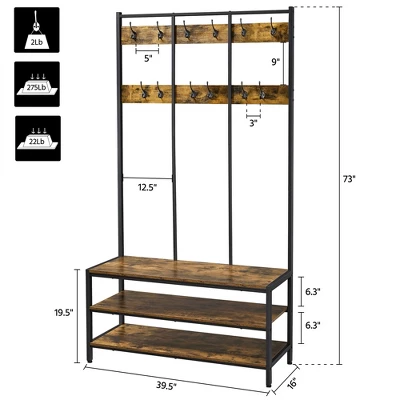 Ready to corral your entryway clutter with this multifunctional hall tree! With one clean-lined entryway rack, you can get 24 coat hooks, 2 shoe storage shelves, and a bench to keep shoes, bags, keys, coats, dog leashes, mittens, and other on-the-go essentials handy and tidy. Constructed of quality metal framework baked finished with rust-resistant paint and CARB P2-compliant manufactured wood, the entryway coat rack boasts competitive durability and strength. Offering the perfect place for shoe changing, the bench with 275lb capacity features 2 racks below to neatly hold shoes out of the way. Bring both fantastic function and industrial farmhouse flair to your entryway, hall, foyer, mudroom, and bedroom. Here listed the size of item: Dimension:39.5″ L x 16″ W x 73″ H;Distance between shelves:6.3”;Bench height:19.5”;Distance between hooks in first level:5”;Distance between hooks in second level:3”; Height between 2 levels:9”; Distance between fixed tube:12.5″; Load capacity: bench: 275lb;each shelf: 22lb; each hook: 2lb;Please see image for exact measurements.