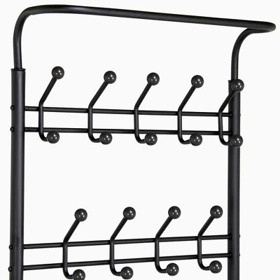 - Multifunctional Rack: The 3-in-1 hall tree is a perfect combination of clothes hanging rack, hooks and storage shelves. It provides 18 hooks for coats, dog leashes, 3 open shelves for backpacks, shoes and 1 top rod for lighter items like scarves, umbrellas.