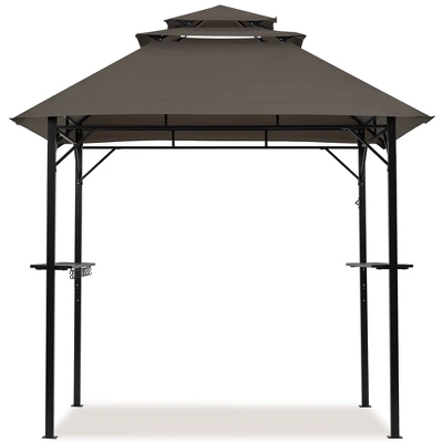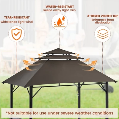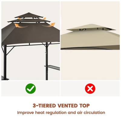 - No more sweltering BBQ parties under the blazing sun! Our 8 × 5 FT Grill Gazebo is designed to elevate your backyard gatherings to a new level. Crafted with sturdy polyester fabric coated in a water- and tear-resistant PA finish, this BBQ gazebo tent is supported by a galvanized metal frame to withstand the elements. Aiming to elevate your outdoor cooking experience, this patio gazebo comes packed with thoughtful features – from two adjustable mesh shelves and 10 S-shaped hooks for extra hanging space to a top hook for lights or plants, and even a built-in bottle opener on the frame. With two sets of fittings included, this versatile outdoor gazebo ensures stability on both soft and hard surfaces. The 3-tiered vented top helps optimize heat dissipation while grilling, improve airflow, and enhance overall wind resistance.