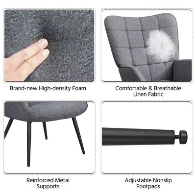 - This accent armchair with ottoman is crafted with premium linen fabric and solid metal legs and is finished with smooth, upholstered seating and backrests, bringing the modern and contemporary style to your space. The accent chair and footstool provide you extra comfort, which you can lounge in and put your feet up. Our accent chair and ottoman will be a good addition to your living rooms, bedrooms, offices, guest rooms, apartments, and small spaces.