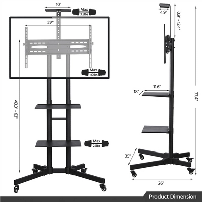 - Strong load capacity: This TV trolley with lockable wheels is constructed of solid steel. The maximum load capacity of the metal screen holder is 50kg/110.2lb, 10kg/22lb of the lower storage shelves, and the top storage shelf can bear up to 1.6kg/3.5lb. For normal use, please do not put overweight items on the shelves.