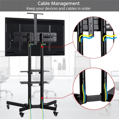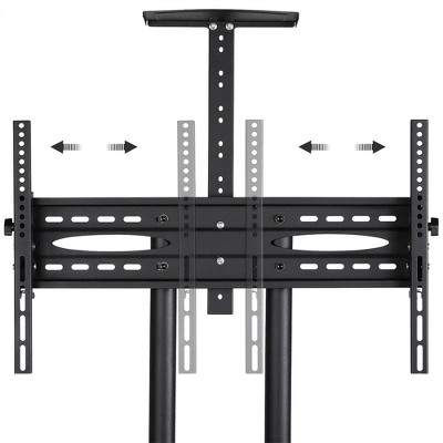 - Our mobile TV stand is a perfect choice with creativity and good quality to provide you with better visual enjoyment. This mobile TV cart is perfect for offices, home theaters, schools, trade shows, hoteling work, stations, gaming and anywhere you need a screen. The flexible TV bracket allows for a 13-degree TV tilt angle adjustment, while its horizontal adjustment makes sure it can perfectly fit TVs ranging from 32″ to 75″. The mobile TV trolley is made of good steel with 4 castors, smooth on both hardwood floors and carpet. Metal frame and storage shelves provide you with much stability and long-time service. All instructions and hardware are provided for assembly, so you can get your new cart assembled and TV mounted in no time!