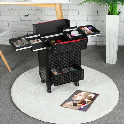 - This 22-inch multitier cosmetics case is designed to help you keep cosmetics and makeup tools in various kinds neat and handy. It has 4 slide-out side trays, equipped with antirust yet durable aluminum sliding tracks for extremely smooth operation, to store small items. The large upper storage compartment is capable of keeping hair tools like hair dryer, flat/curling iron, palettes and other cosmetics in relatively large size. The bottom drawer can hold hair brushes and short bottles. Detachable all-directional rolling wheels make this trolley makeup case convenient to carry around. Minimalist design and chic style render it stand out from all the cosmetic case on markets. Aesthetically pleasing professional makeup train case with powerful functions.