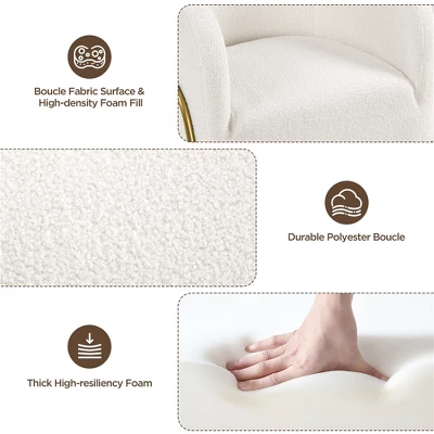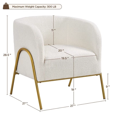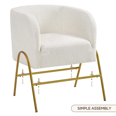 - Choose this boucle barrel accent chair with gold metal legs. It’s made of a solid & manufactured wood frame, gold-tone metal legs and soft-to-the-touch boucle upholstery, providing excellent sturdiness and ultimate comfort. Soft padded with thick high-density foam, this armchair offers a perfect spot for you to lounge with a good book or converse with guests. The smooth curved backrest perfectly fits your back, providing just-right upper body support for longer sittings. The combination of cozy boucle upholstery and splayed golden legs adds a touch of glam and personality to your home. The compact size and lightweight design make this side chair ideal for living rooms, bedrooms, apartments, studios, offices and more.