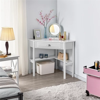 - This sturdy corner computer desk is made of high-quality premium MDF desktop and pine legs, which ensures its long life span. Its large desktop and corner design provide spacious working space, 2 shelves and a large drawer give ample space for your stuff. The proper size of this computer desk workstation makes it can be used as a wiring desk, office workstation, home or study desk and so on. Modern style makes it suitable for any decor of your home, study and office.
