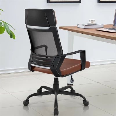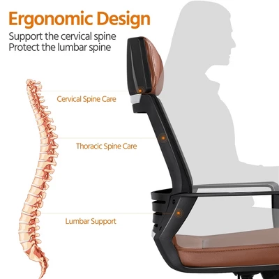 - This adjustable office chair is constructed of premium PU leather, sponge, plywood, PP and steel material, with a solid structure holding up to 300 lb, sturdy and for long-term use. The adjustable seat height range is 17-19.2″, which could meet your varied needs. 360° swiveling design allows you to move the chair or fetch files/books. This swivel office chair features a high ergonomic backrest with built-in lumbar support, which provides improved lower back comfort. The padded headrest lets you recline comfortably while taking a call or simply relaxing. Stylish design makes it compatible seamlessly with any décor of occasion.