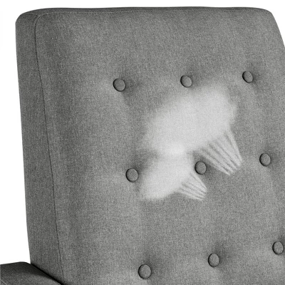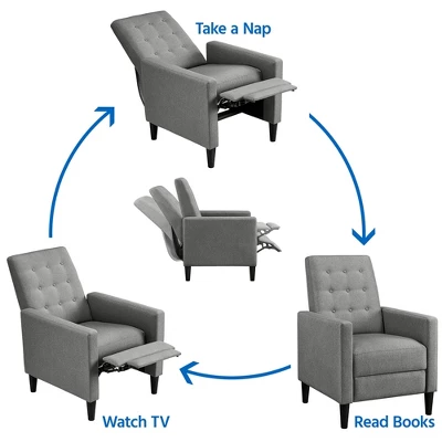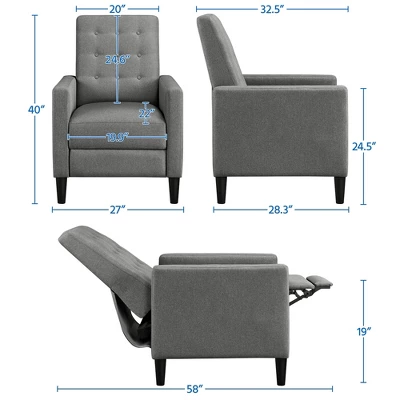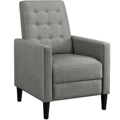 - Spruce up your bedroom or living room in streamlined style with mid-century modern fabric recliner. Founded atop four conical legs in black finish, this piece features a manufactured wooden frame, foam fill, and solid-hued 100% upholstery that’s easy to clean and durable to use. The button-tufted details on the back showcase a touch of texture, and its neutral color tone can coordinate with any home decor. Fully reclined back and pop-up footrest let you relax and kick back with a movie after a long day at work.