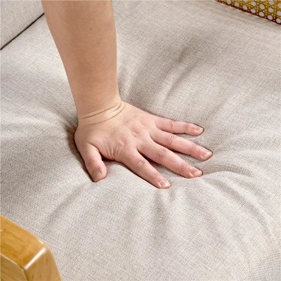 - Materials: Polyester fabric, Rubberwood, Pine wood, Foam, Springs, Rattan