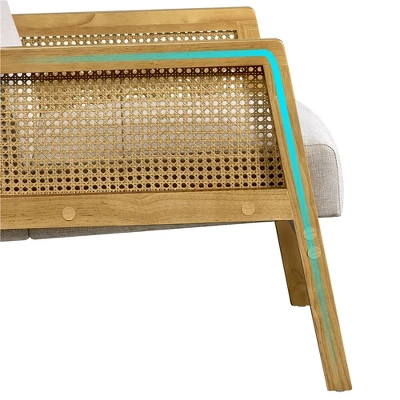 - Adds a beachy look to your sitting area with this upholstered armchair. Its rectangular, cane paneled arms, splayed legs and cozy fabric upholstery add a stylish and elegant touch to your space. It’s crafted with a solid wood frame and sits on tapered rubberwood legs in a natural hue. A slanted backrest and extra-wide cushioned seat along with long armrests provide ample comfort and support in any seating position. This chair is upholstered in polyester that is breathable and close to the skin. The high-density foam-filled seat is supported by four sinuous springs, extending its service time. A simple design meets a warm, neutral color palette, making it ideal for living rooms, bedrooms, home offices, sunrooms, lounges, balconies and more.