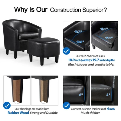- 【Sleek&Luxurious】The club chair and ottoman perfectly combine straight and curved silhouettes and are finished with faux leather upholstery for a luxurious touch, bringing a sleek and chic look to your room. The barrel shape of the chair perfectly complements the semicircle ottoman, this eye-catching set will stand out in any room.