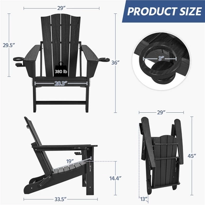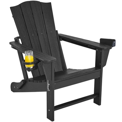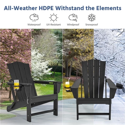 - This HDPE Adirondack chair blends comfort, style, and durability for any outdoor setting. It has a wide seat, tall backrest, and spacious armrests, so it provides superior relaxation for your patio, deck, or backyard. Made with all-weather HDPE, it resists heat, water, snow, and UV rays, ensuring long-lasting use in any climate. The elegant wood-like surface adds a vintage touch to your outdoor space. A convenient cup holder, a wine glass holder, and a phone stand are built into the armrests for easy access to your drinks and devices. With a foldable design and locking pins, it’s easy to store and save space when not in use.