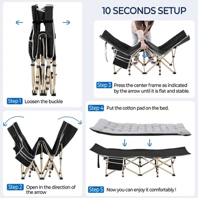 - Getting involved in fun outdoor activities has become a popular lifestyle. However, staying in nature sometimes is an energy-draining thing. The most effective way to refresh is to take a good nap. Let this upgraded foldable camping bed be your good sleep generator.Its tiltable headrest design and adjustable angle offer versatility, making it suitable for napping or relaxation.This foldable camping cot is a comfortable and practical choice for outdoor enthusiasts and office workers, offering a cozy and convenient sleeping solution wherever you go.