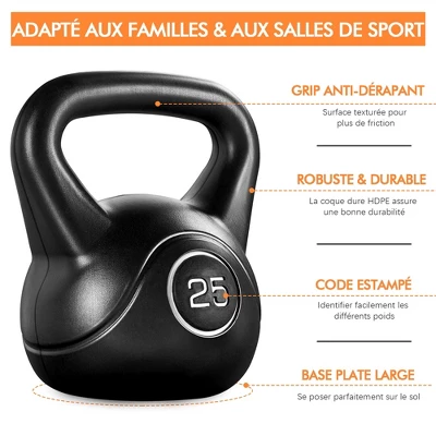- Reap the benefits of this versatile kettlebell! Made of durable HDPE hard shell and cement filling, this kettlebell is a cost-effective alternative to the traditional cast iron kettlebells. The HDPE coating protects your floors especially when dropped accidentally. The wide grip allows you to comfortably hold the weight with one or two hands, and swing it conveniently and safely.
