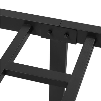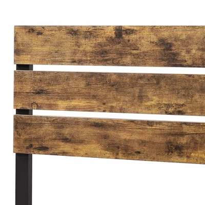 - Crafted from premium iron in a black finish, this bed frame has a clean silhouette and is completed with an open horizontal bar headboard. The combination of metal slats and a wooden headboard brings a sleek but warm accent to your home. Constructed with a slatted structure, the bed base is sturdy and reliable for every restful night. The headboard is made of CARB P2-compliant MDF boards for your family’s health. A spacious room under the bed helps to expand the limited storage space in your bedroom. This bed frame will perfectly fit in the bedroom, guest room, apartment, and more.
