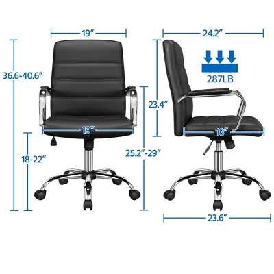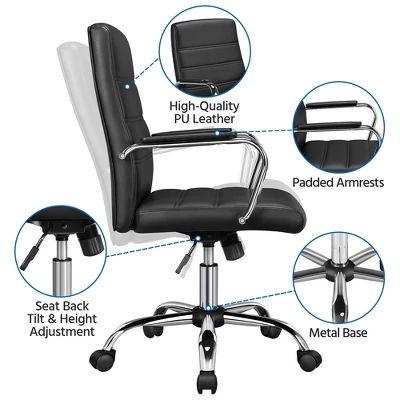 - A desk chair like this is an ideal option for getting comfy sitting experience, while also introducing an on-trend contemporary look. We apply quality PU leather upholstered fire retardant foam cushioning for the seat and back, and antirust chrome-plated steel for the arm and star base. Twisting and turning about is integral within the office and best optimal desk use. The 360° swivel seat and wheels of this mid-back office chair ensure the must-have mobility. And with the tilt-lock mechanism and seat height adjustment, you can customize your seat to your preference.