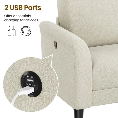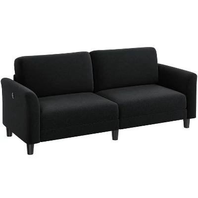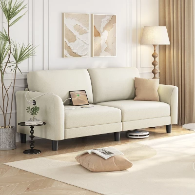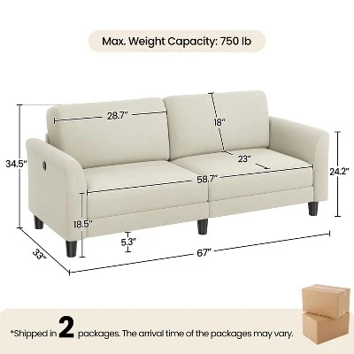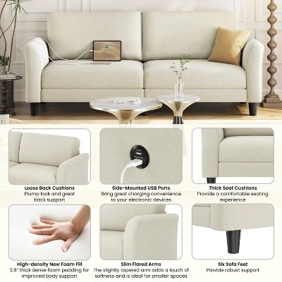 - This 2-seater upholstered sofa seamlessly blends form, function, and comfort to craft a welcoming spot in your home where you can temporarily escape the hustle and bustle of the world. Flared arms, soft fabric upholstery, and tapered legs are all elegant features that help to balance the contemporary silhouette. With a seat size of 58.7 × 23.2″ (WxD), this fabric sofa can accommodate 2-3 family members or guests, and it’s also perfect for one person to sit in various positions for a more cozy relaxation. The two built-in USB charging ports add to its functionality. Some assembly is required.