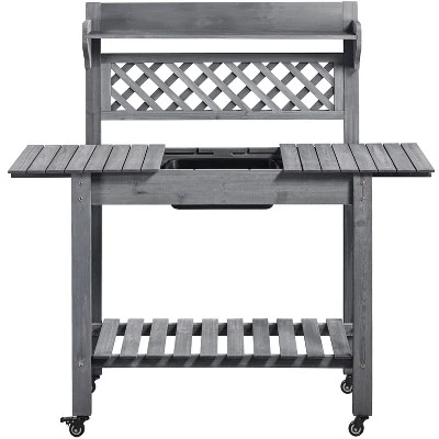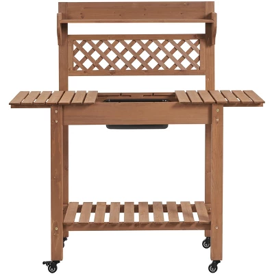 - This 100% fir wood rolling gardening console combines a natural, rustic charm with functionality, enhancing your horticulture experience while blending seamlessly into your garden or backyard. Designed with practicality in mind, it features a removable, easy-to-clean sink beneath the tabletop, suitable for handling messy tasks like transplanting, soaking potted plants, or mixing soil, all while keeping your workspace tidy. Ample storage is another standout feature. The elevated rack, grid wall, and open shelf provide convenient organization, ensuring your tools and essentials are always within reach. Equipped with four smooth castors, this bench is easy to move, eliminating the hassle of repositioning large garden furniture.