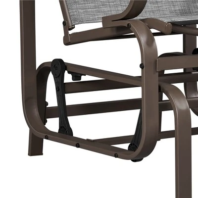 - Transform your outdoor space into a haven of relaxation with this Outdoor Glider Chair. Built to withstand the elements, it features a powder-coated steel frame and durable, breathable sling fabric that ensures long-lasting comfort and usability. The chair’s smooth gliding motion offers a tranquil escape, ideal for enjoying your morning coffee or unwinding under the stars. With an ergonomic high backrest, arched head support, and curved rods, it provides natural alignment and exceptional comfort for hours of lounging. Easy to maintain and weather-resistant, this glider chair is the ideal addition to your patio, porch, or garden, combining style, durability, and effortless charm.
